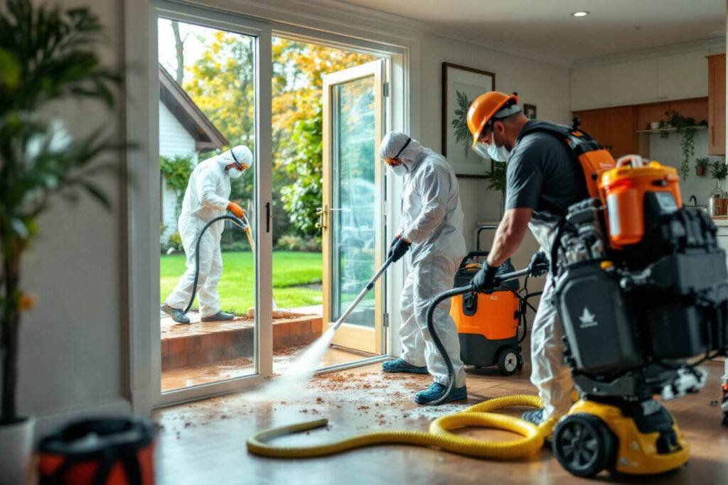 Professionals should wear gloves, masks, protective suits, and boots to prevent direct contact with contaminants. This protects both the technicians and occupants of the property.